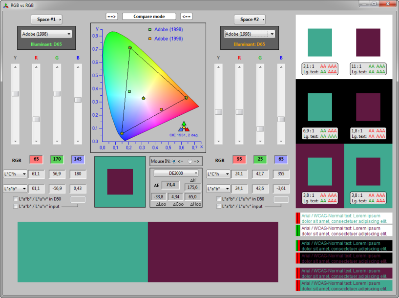 On the right of the RGB vs RGB window, we see patches of the two selected colors, defined in the Space #1 and Space #2 sections of the