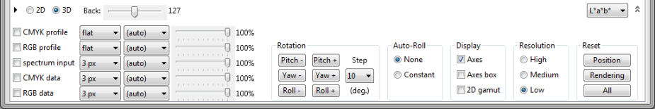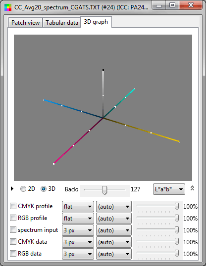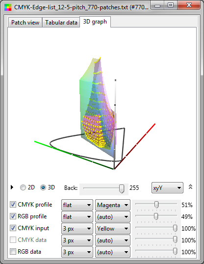 The CMYK and RGB profiles are displayed as polygons; the input, CMYK and RGB data is displayed as individual points. Not all inputs may be