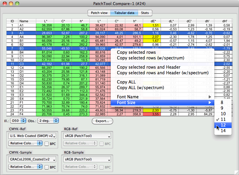 The features of the “Tabular data” tab of a Compare window. Reference data is shown on a green background and Sample data is shown on a light-red background. You can assign different CMYK and RGB profiles to the Reference and Sample (if data with these color spaces was not imported in a file). Please consult the "Tabular data" tab of single file windows page for a description of the features which are common with this tab in Compare files. While it is not possible to view spectral values in this Compare tab, spectral data is still used internally if present in the reference or sample file which are compared. It is thus possible to copy the spectrum of selected patches in the clipboard, to see the spectrum in the "Info" window, and to export it to a file.