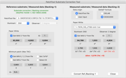 Use the Substrate Correction tool to convert measurements taken on a backing material, a black substrate for example, as if they were taken on another backing, a white substrate for example, as described in ISO 13655:2009, Annex A. You can also use it to convert standard or custom colorimetric aims data sets, the aims of ISO 12647-2 for example, when your substrate/paper is not within tolerance, as described in ISO/PAS 15339-1.