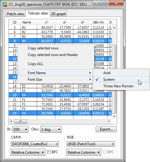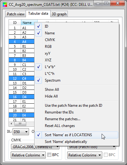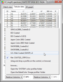 A file opened in PatchTool has its own window that can be set independently of the others. The file data as well as derived data is presented in the "Tabular data" tab. The popup menu shown above appears when you do a right-click on any cell within the table.A right-click in the table header will trigger the menu shown below, on the left. To edit a patch name, click in any cell of the “Name” column; you can also rename a patch by selecting the "Rename the patch..." menu in "Patch view" alternate contextual menu (shift + right-click). You can associate any ICC profile to CMYK and RGB data if such data was not found in the file, as shown below, on the right, for CMYK data; the last two menu items are shortcuts to folders which contain ICC profiles. Please consult the PatchTool Help manual for more information.
